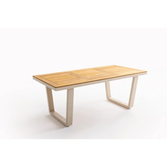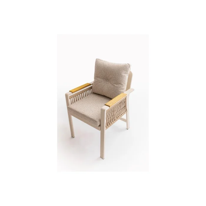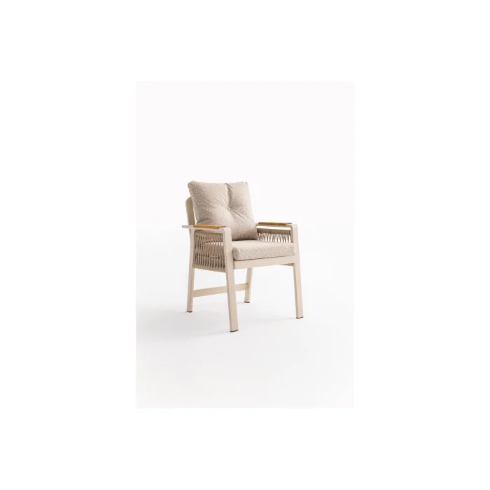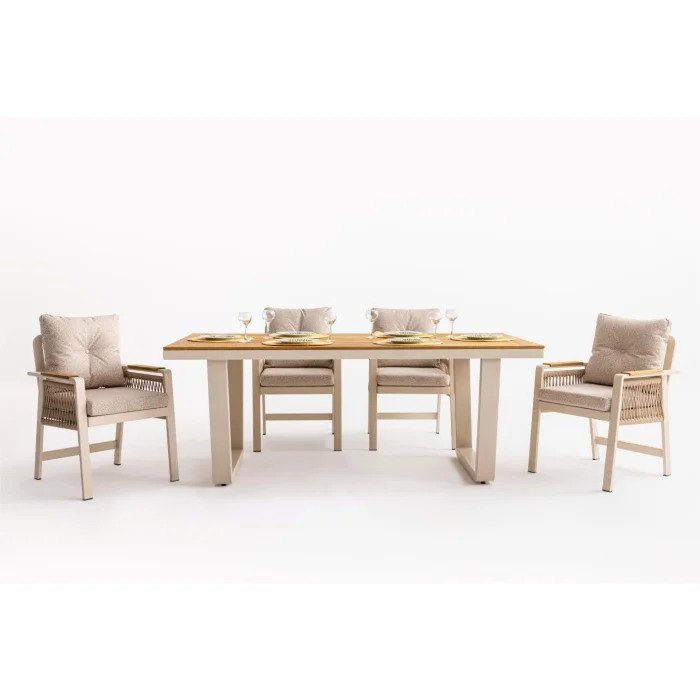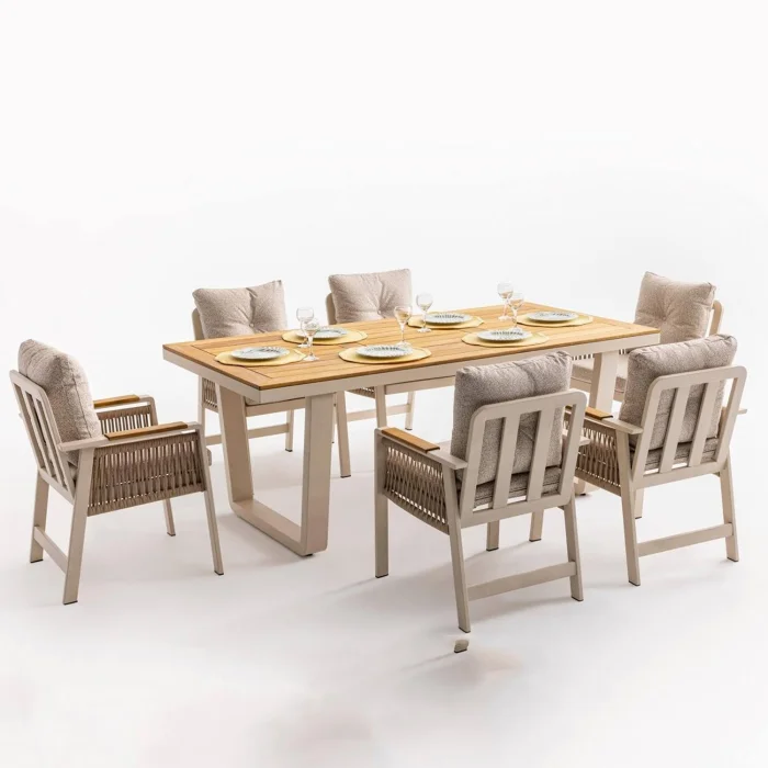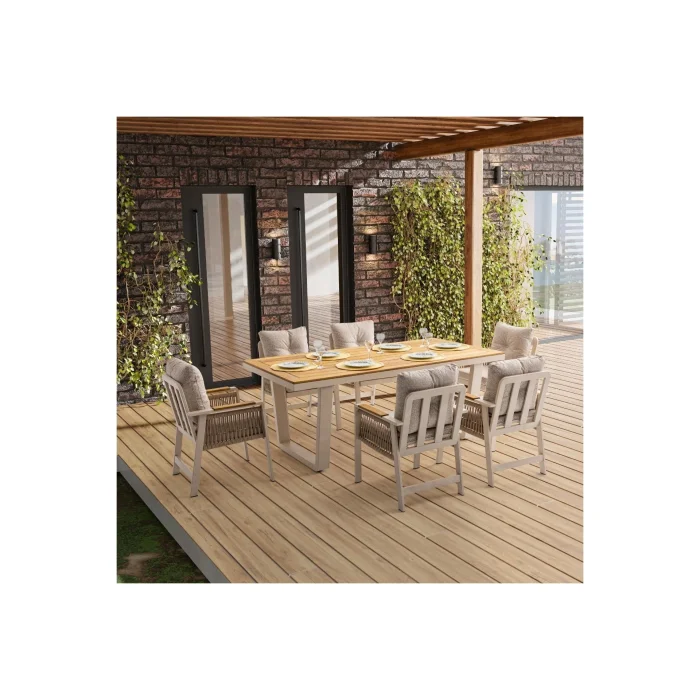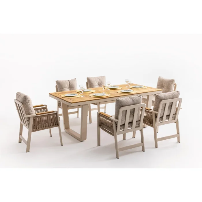 Artemis Plus Table set consists of a table and 6 chairs. The collection combines functionality and modern arm design in a single product. The Ireko Wood detail on the arms and Luxio-Cord Outdoor Rope Weaving add warmth to the aluminum frame.