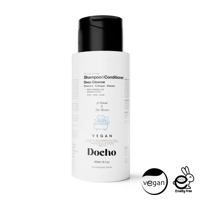Thanks to the Activated Carbon in its Deep Cleanse composition, it helps to maintain the sebum balance in the skin structure and provides deep cleaning. With Acacia Seyal Gum Extract, known as Vegan Collagen, in its formula, it contributes to the formation of healthy and shiny hair by stimulating the hair follicles and follicles, helping to reduce hair loss. With the Chamomile and Jojoba oil it contains, it helps to reduce irritation, allergies and crusting and redness on the skin. With Menthol in its composition, it has a soothing, cooling effect, and helps in the treatment as an anti-itch. Thanks to the Vitamin E & Vitamin B5 in its composition, it supports the increase of the moisture balance of the skin and hair structure, while helping to nourish, repair and strengthen the irritated and/or damaged skin. Thanks to its rich and intense herbal content in its composition, it helps the hairs to be easily combed and shaped, while thanks to the vitamins it contains, it nourishes the skin, accelerates cell renewal, and ensures that the skin and feathers have a healthy appearance.• Provides deep cleaning.• Prevents and purifies fleas, ticks and pests.• Strengthens the hairs and reduces their shedding.• Brightens the hairs, increases skin elasticity. CollagenIt is a type of protein that increases skin elasticity and helps keep hairs strong and healthyIt also maintains the moisture balance of the skin and reduces the signs of agingMoreCharProvides deep cleansing of the skin, attracts toxins and impurities, supports the hair to look healthy and shinyMoreVitaminsEssential nutrients necessary for skin and coat health. Vitamins maintain the moisture balance of the skin and contribute to the nutrition of the hair. MoreJojoba OilNot only restores the moisture balance of the skin, but also nourishes and brightens the hairs, also softens dry areas on the skinMoreChamomileHelps soothe the skin and reduces itching and irritationProvides a relaxing effect, especially for sensitive skinMoreAcacia CollagenSupports the healthy appearance of feathers and skin, increases the strengthening and elasticity of hairs. MoreVitamin E & B5Maintains the moisture balance of the skin and improves the health of the hairs It supports, also helps to repair the skin. How Do We Use More? The hair of cats and dogs is moistened with water, then a sufficient amount of Docho Deep Cleanse Shampoo & Cream is applied by massaging the whole body. How Much?After waiting for 1-2 minutes, rinse with plenty of water. When? For best results, style the hairs by combing them while drying. To which region? It can be applied to the whole body. Additional Tips? By combing the hairs during drying, you can make them look brighter and healthier. Frequently Asked QuestionsWhat is the purpose of Docho Shampoo & Cream - Deep Cleanse - Charcoal & Collagen & Vitamin? Docho Shampoo and Cream is an effective product for cats and dogs that can be used on all breeds and coat structures. It is also effective in removing fleas and ticks. While it helps to maintain the sebum balance in the skin structure, it provides deep cleaning. It helps reduce hair loss by stimulating hair follicles and follicles and contributes to the formation of healthy, shiny hair. In addition, it strengthens the physical barrier on the skin surface and supports the nourishment of irritated or compromised skin. It helps relieve skin reactions such as itching, redness, crusting, allergies and skin rashes. What is the usage and dosage of Docho Shampoo & Cream - Deep Cleansing - Deep Cleanse - Charcoal & Collagen & Vitamin? It is applied deeply by wetting the hair of cats and dogs with warm water so that there is no dry place, and massaging the whole body with a sufficient amount of docho deep cleanse shampoo & cream. After waiting for 1-2 minutes, it is thoroughly rinsed with plenty of water. For best results, it is recommended to comb the hairs during the drying process. Does Docho Shampoo & Cream produce any change in coat color in white-haired dogs due to the charcoal content? While Docho Shampoo & Cream provides deep cleansing for dogs with white or cream-colored coats, it does not affect coat color at all.