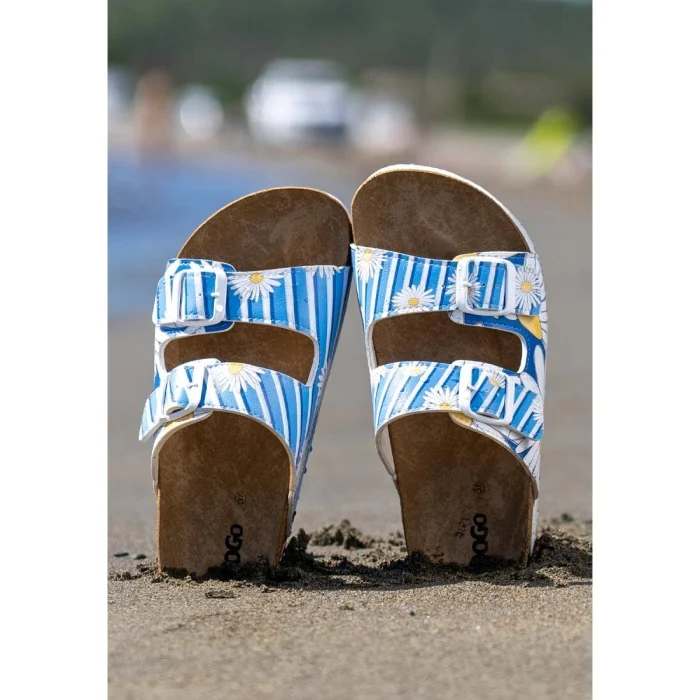 Product: Women Vegan Leather Slippers - Daisy Stripes Design