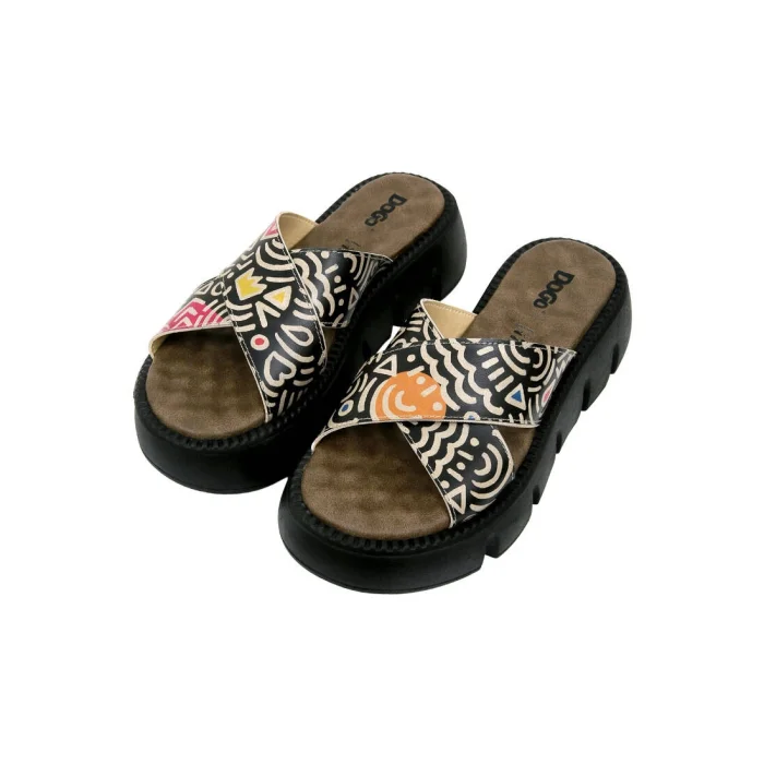Product: Women Vegan Leather Wedge Slippers - Abstract Outline Design