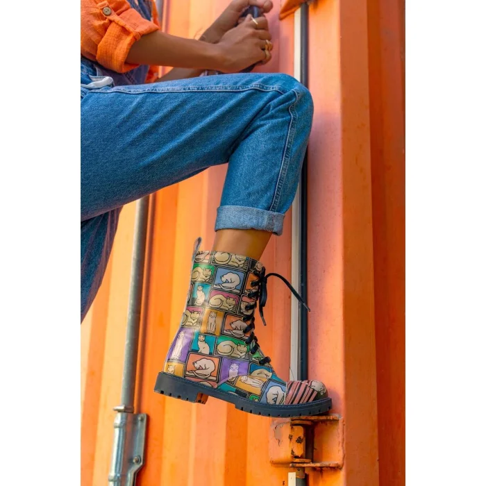 Product: Women Vegan Leather Zipper Long Boots - Cats And Boxes Design