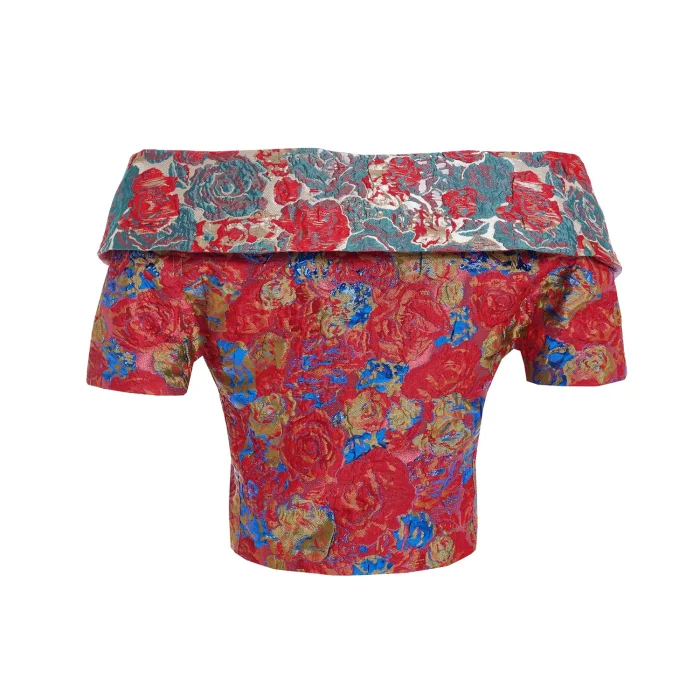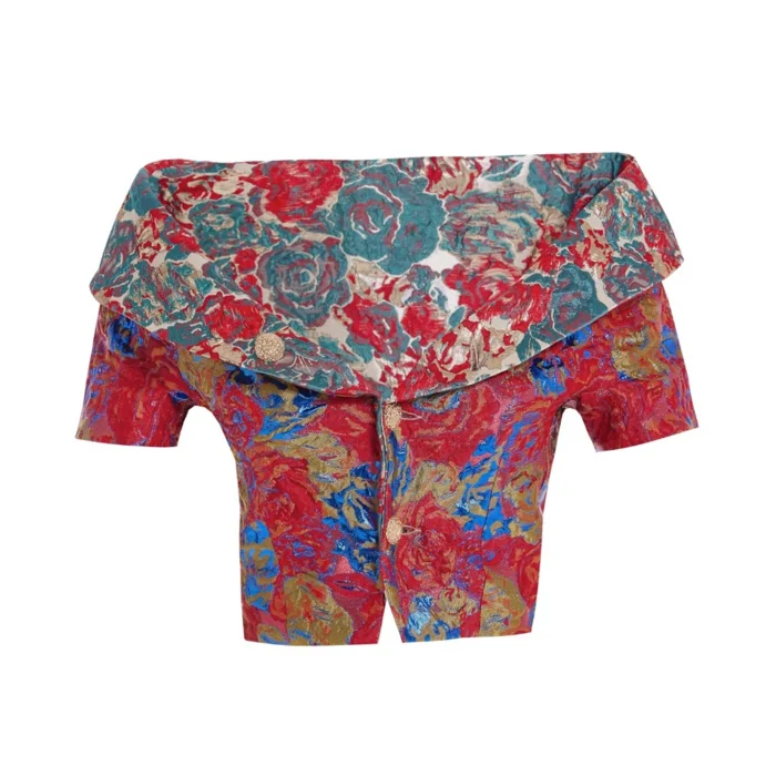 Double-sided jacket made from jacquard brocade fabric with metallic woven details, featuring gold buttons and shoulder cut-outs. Material: 100% PES Brocade fabric is typically made from fibers like cotton, silk, or polyester, and is known for its intricate woven patterns on the surface. These patterns often have a shiny appearance, creating a contrast in texture and color with the base fabric.