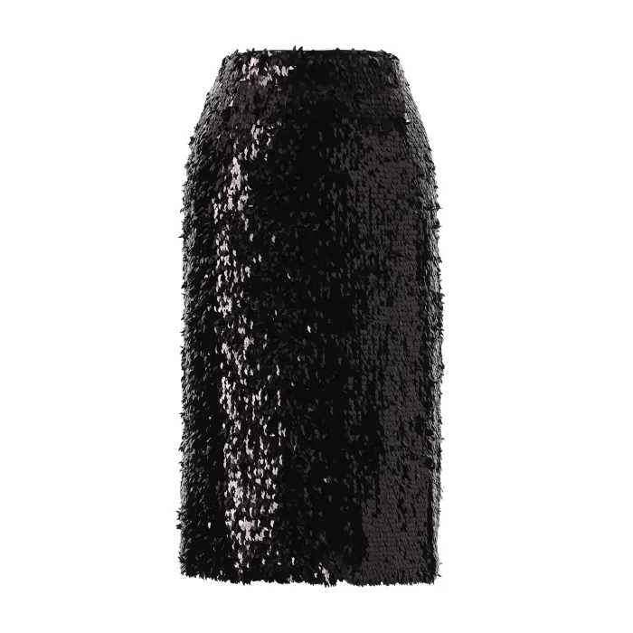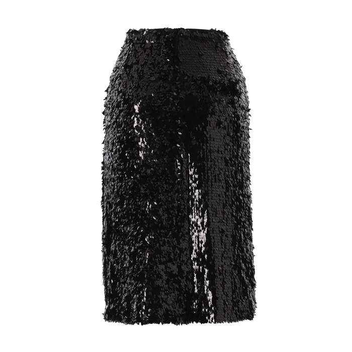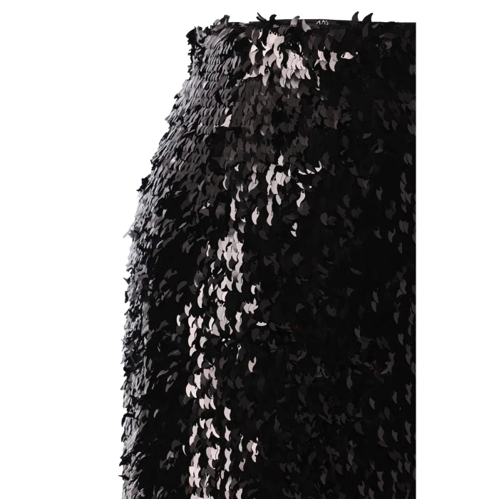 Black drop-cut sequined midi skirt. Satin jumpsuit lining. Hidden zipper at the back.