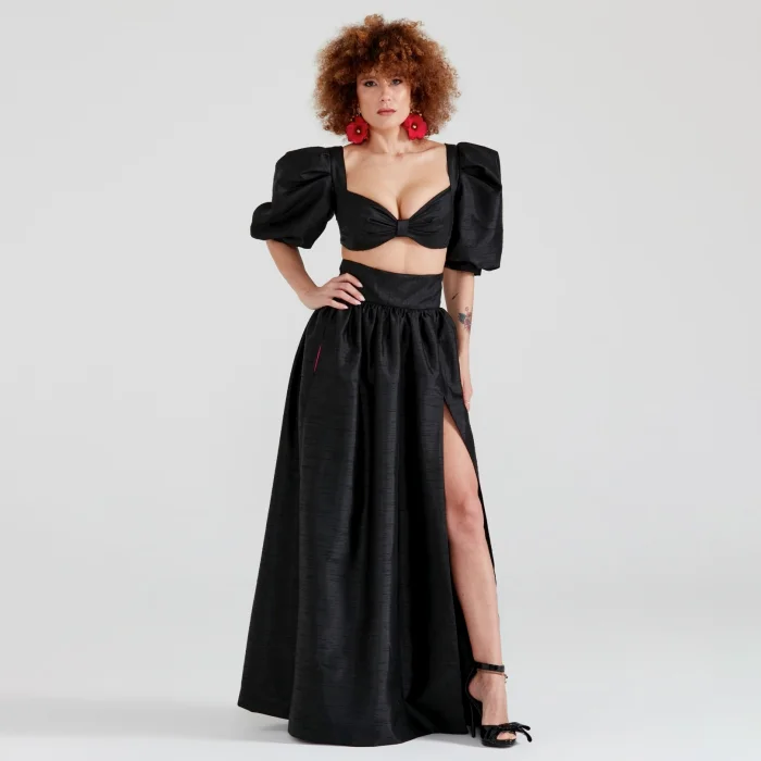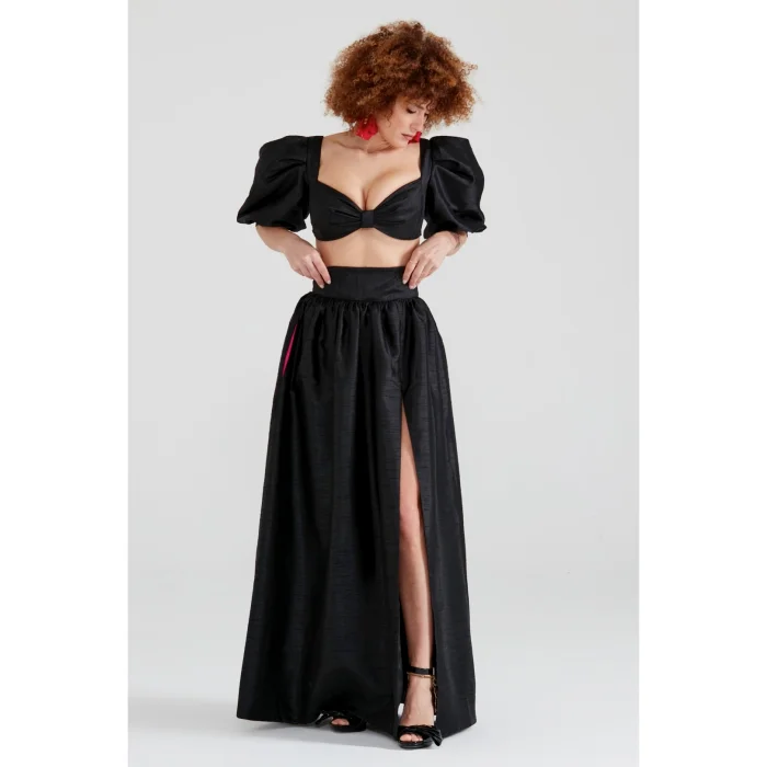 It can be paired with puff-sleeve bustier options in black, grey, or red.
