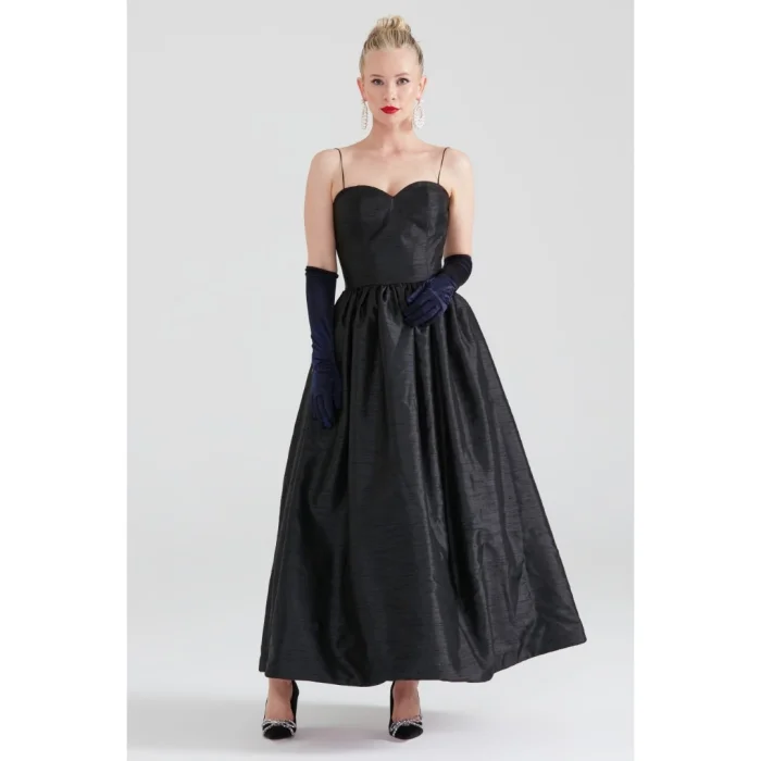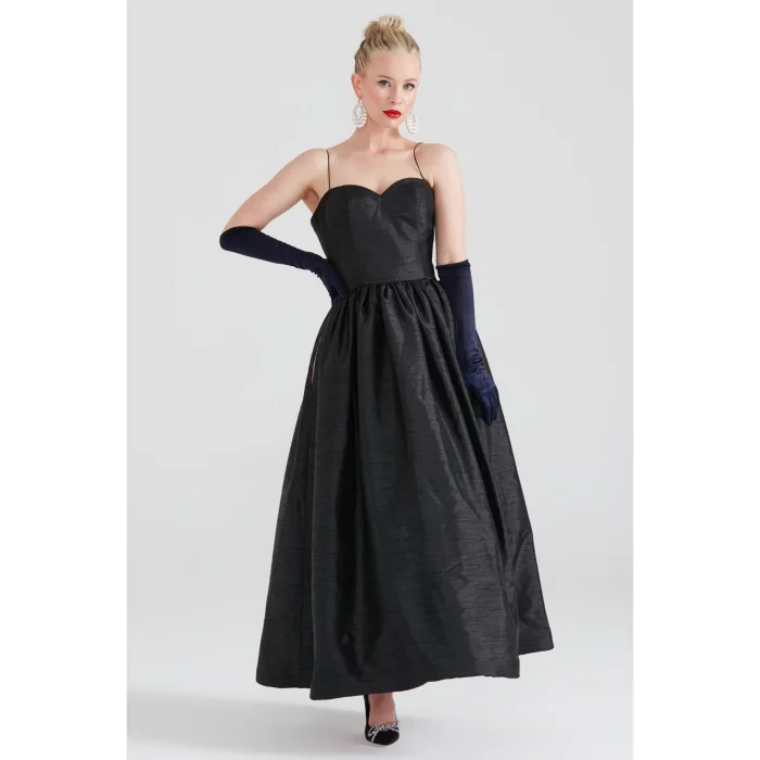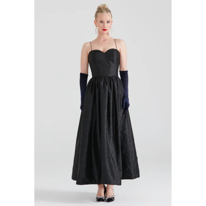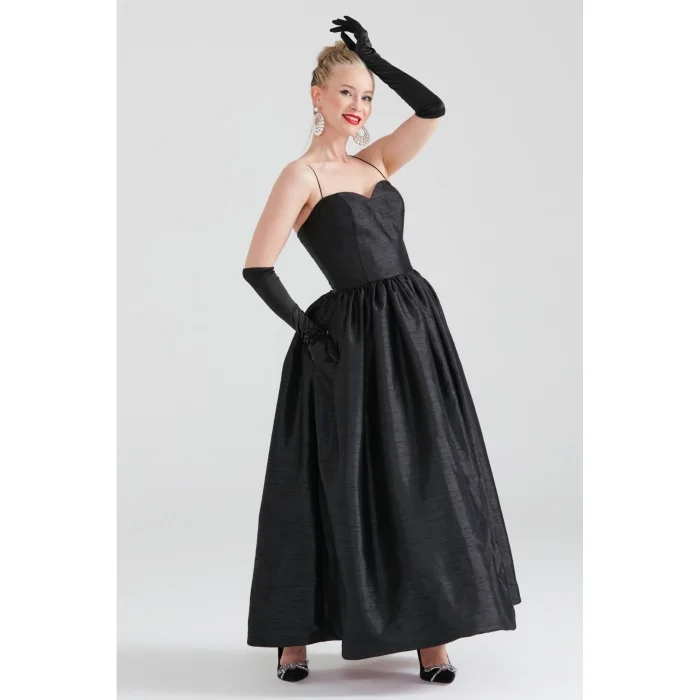 Sweetheart neckline, thin straps (optional conversion to strapless if folded inward), with a gathered waist, pocket details, and maxi length. Blush pink satin lining.
