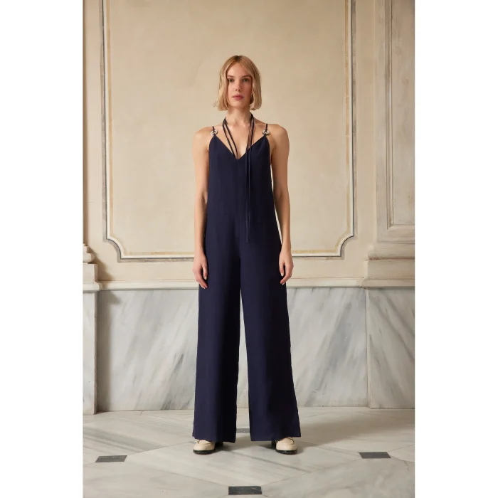 Wide leg jumpsuit, v-neck with spaghetti straps, 100% Belgian Linen, Model Size: S - Height:176 cm, Bust: 81 cm, Waist:64 cm, Hips: 89 cm