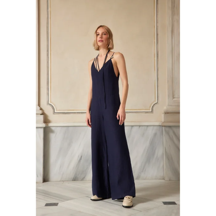 Wide leg jumpsuit, v-neck with spaghetti straps, 100% Belgian Linen, Model Size: S - Height:176 cm, Bust: 81 cm, Waist:64 cm, Hips: 89 cm