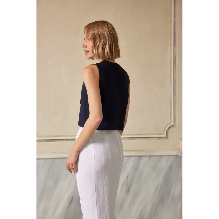 Cropped round neck blouse, front closure with tie, 100% Belgian Linen, Model Size: S - Height:176 cm, Bust: 81 cm, Waist:64 cm, Hips: 89 cm