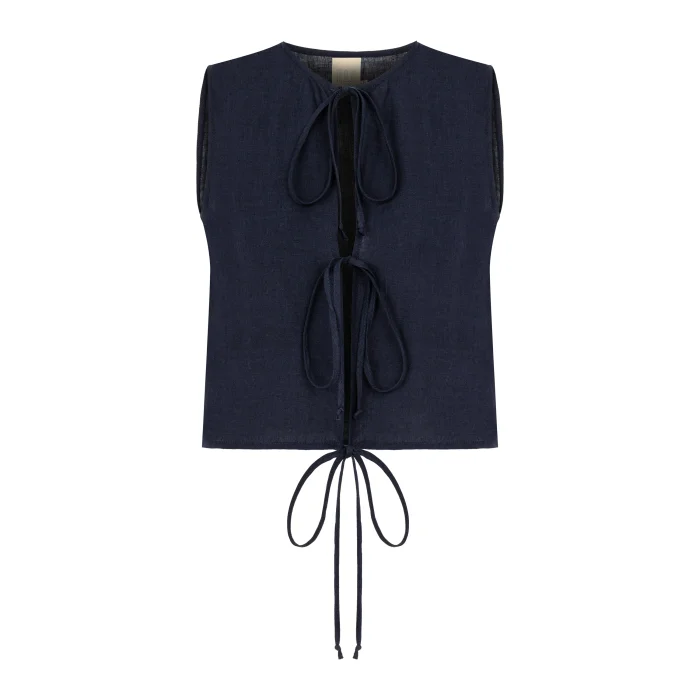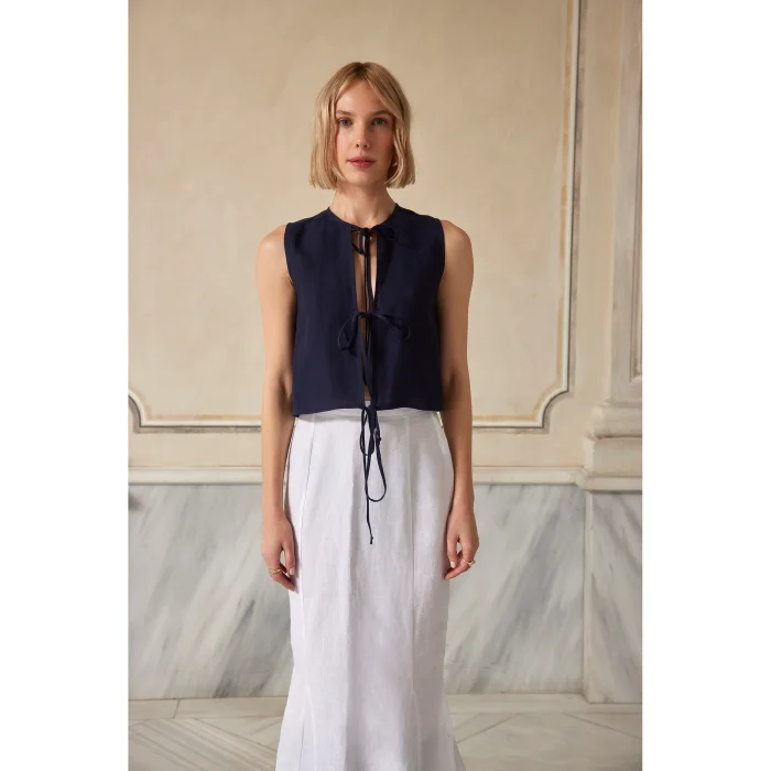 Cropped round neck blouse, front closure with tie, 100% Belgian Linen, Model Size: S - Height:176 cm, Bust: 81 cm, Waist:64 cm, Hips: 89 cm