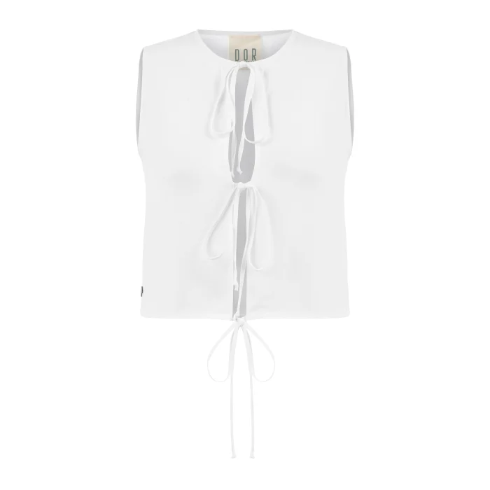 Cropped round neck blouse, front closure with tie, 100% Belgian Linen, Model Size: S - Height:176 cm, Bust: 81 cm, Waist:64 cm, Hips: 89 cm