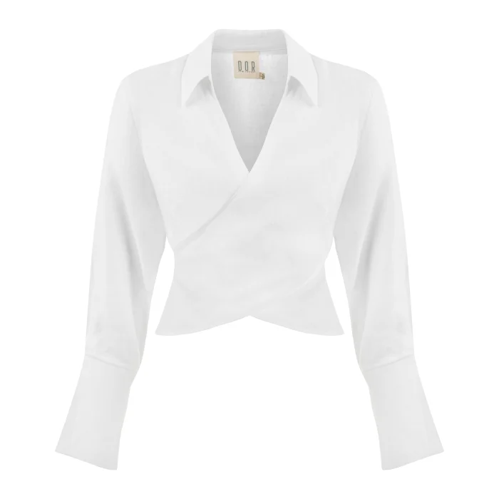 V neck wrap shirt, button fastening at back waist, cutout at waist, 100% Belgian Linen, Model Size: S - Height:176 cm, Bust: 81 cm, Waist:64 cm, Hips: 89 cm