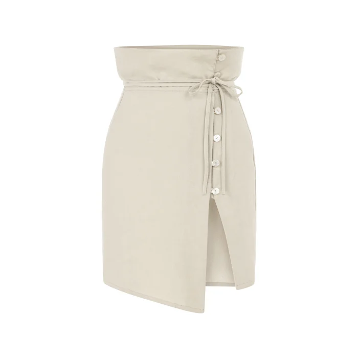 High waisted mini skirt, button down asymmetrical slit with spaghetti strap belt, 100% Belgian Linen, Model Size: S - Height:176 cm, Bust: 81 cm, Waist:64 cm, Hips: 89 cm