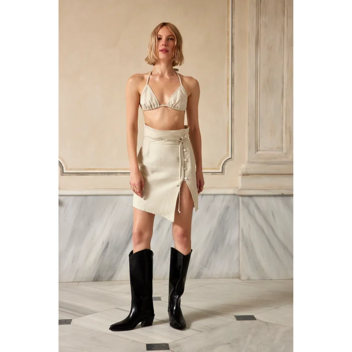 High waisted mini skirt, button down asymmetrical slit with spaghetti strap belt, 100% Belgian Linen, Model Size: S - Height:176 cm, Bust: 81 cm, Waist:64 cm, Hips: 89 cm