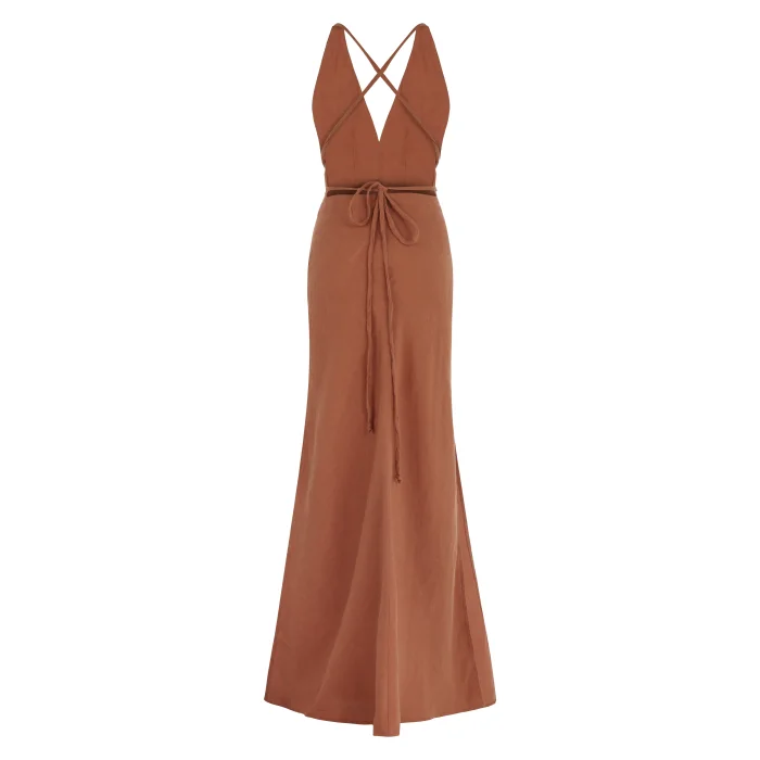 Long mermaid cut dress with deep décolleté rope straps tied at the back