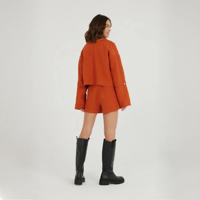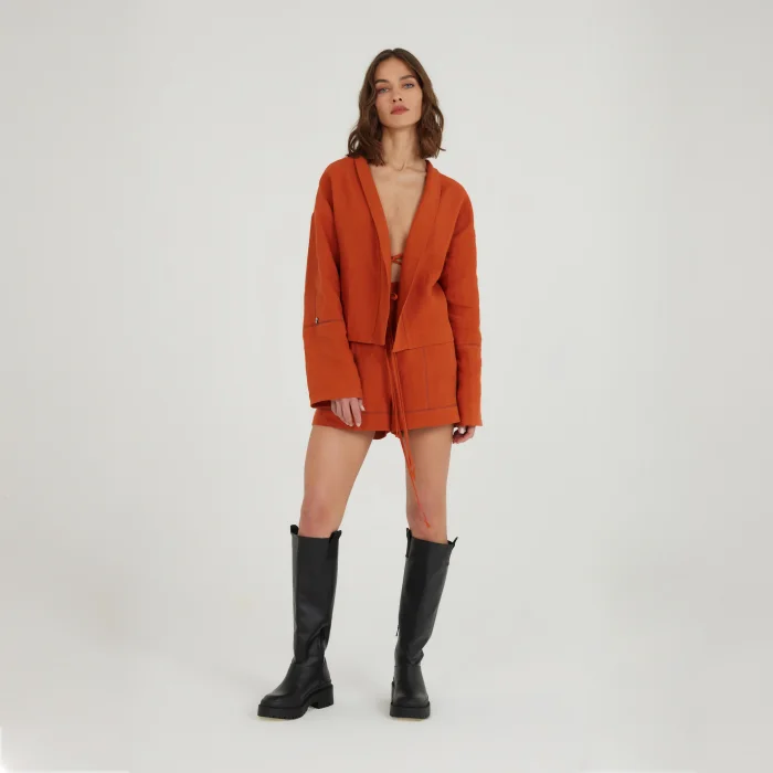 Lace-up detailed, shawl neckline double-sided linen blouse