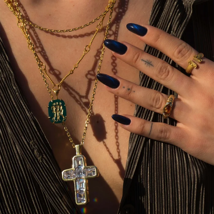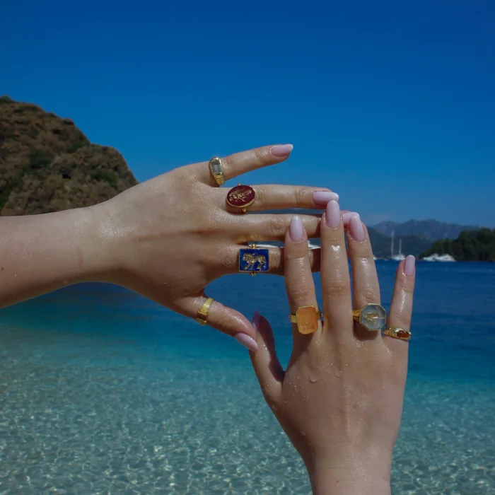 The Ring of the Eye of Gaia is hand-carved with 22K Gold Vermeil and Hessonite. The ring is named after Gaia, the ancestral mother and goddess of the earth. It is believed that all aspects of the Earth are completely under Gaia's control. With her empowering and healing abilities, the immortality of a goddess is represented by her unending, renewed vitality. Hessonite represents its power over nature, and the golden brilliance surrounding the gemstone represents its holistic energy.