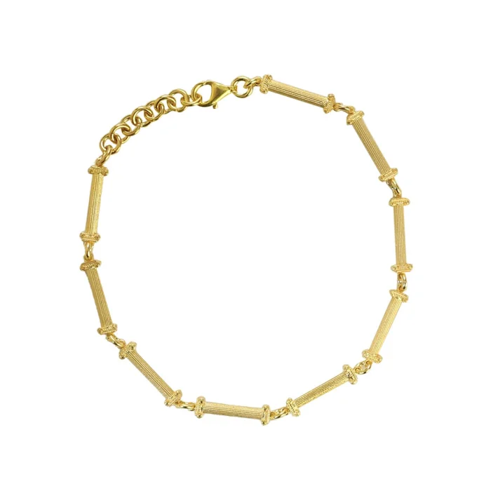 The 22K Gold Vermeil Ionic Bracelet was inspired by the Temple of Athena Nike, an Ionic tetra-style temple built around 420 BC and known for its magnificent ionic columns. Ionic columns are considered the tallest, thinnest and most decorative temples. Dimensions: 18 cm + 2.5 cm (extension)