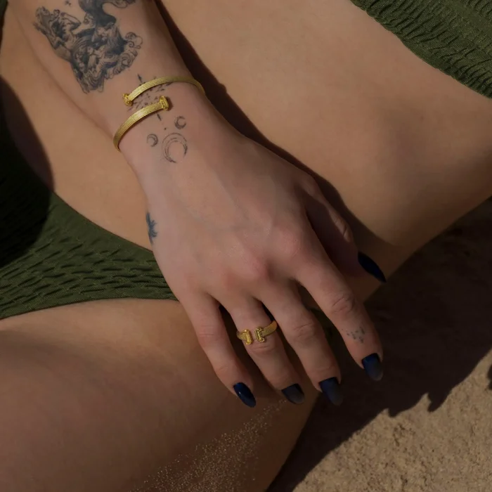 The Ionic Cuff in 22K Gold Vermeil is inspired by the Temple of Athena Nike, one of the most well-known structures for its ionic columns, an Ionic tetrastyle building completed around 420 BC. Length: 18 cm