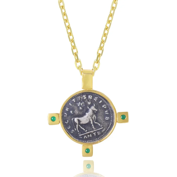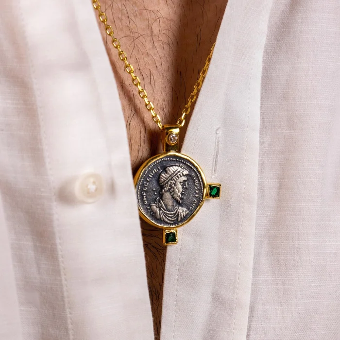 The Julian II ""The Apostate"" Coin Necklace is an authentic ancient Roman coin in mint condition. Hand-carved 22K Gold Vermeil with three Root Emerald accents surrounds the coin, complete with a shimmering Zircon gemstone. Julian II, "The Apostate", controlled the Western Empire as Caesar from 355 to 360, and in 360 his legions welcomed him as Augustus in Lutetia (Paris). (Pendant Size: L: 4.5 cm - W: 4.2 cm) *This is an imitation of an original antique coin. 22K Gold is cast in Vermeil and 22K Gold is cast in Vermeil chain.