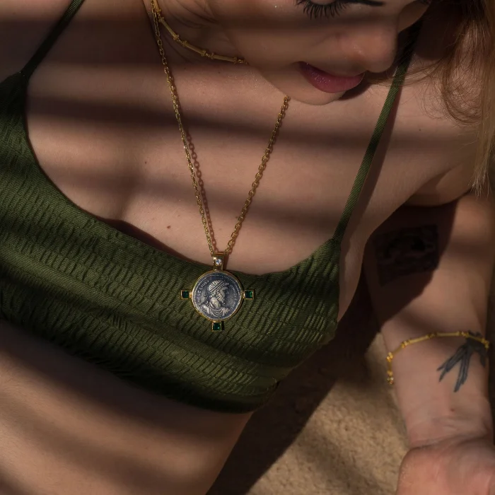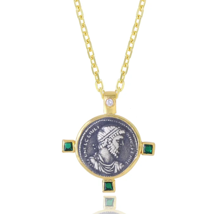The Julian II ""The Apostate"" Coin Necklace is an authentic ancient Roman coin in mint condition. Hand-carved 22K Gold Vermeil with three Root Emerald accents surrounds the coin, complete with a shimmering Zircon gemstone. Julian II, "The Apostate", controlled the Western Empire as Caesar from 355 to 360, and in 360 his legions welcomed him as Augustus in Lutetia (Paris). (Pendant Size: L: 4.5 cm - W: 4.2 cm) *This is an imitation of an original antique coin. 22K Gold is cast in Vermeil and 22K Gold is cast in Vermeil chain.
