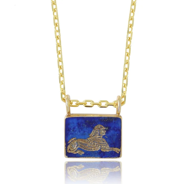 The Sphinx Necklace is a hand-carved lapis lazuli gemstone shaped with 22K Gold Vermeil. The carving on the gemstone is a drawing of the ancient Egyptian mythological creature SPHINX, with a human head, a lion's body, and falcon wings. In Egyptian culture, the Sphinx was decorated and symbolized by royalty, sacred status, and the sun god, the Sun God, Horemakhet, or the Horizon Horus. To complement the craftsmanship in the stone, the carvings are decorated with a gold leaf. (Pendant Size: L: 2.2 cm - W: 2.1 cm)