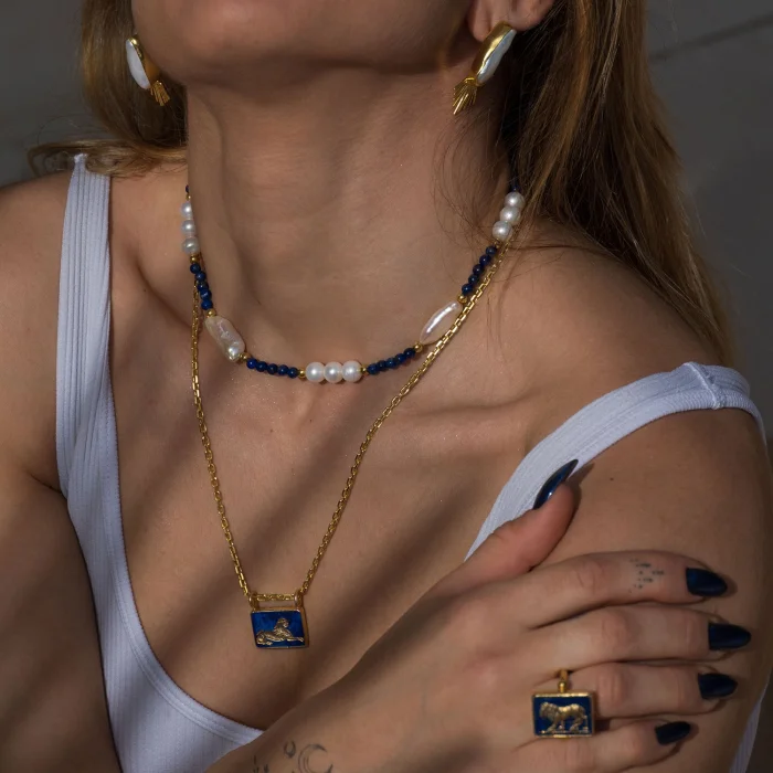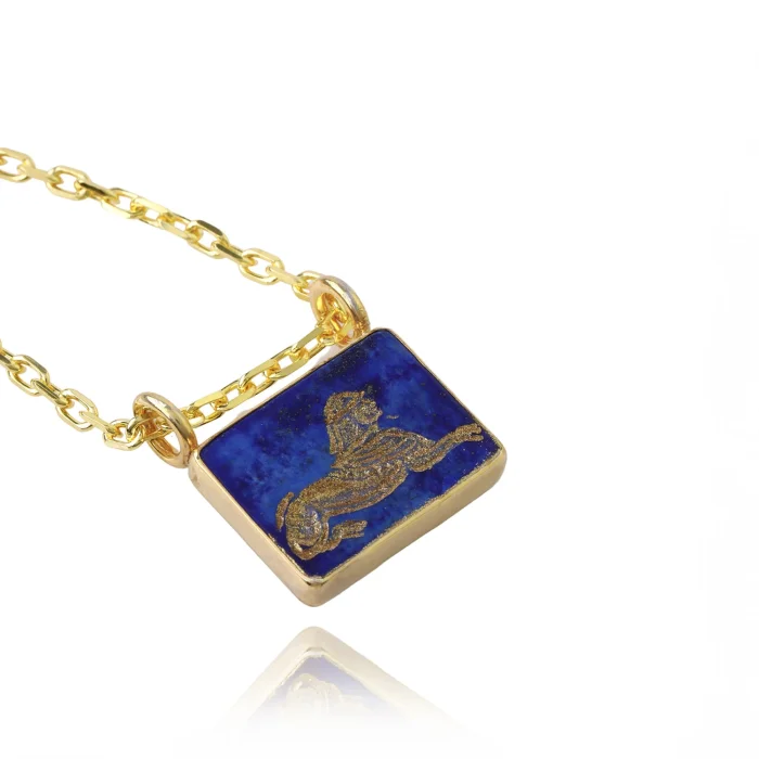 The Sphinx Necklace is a hand-carved lapis lazuli gemstone shaped with 22K Gold Vermeil. The carving on the gemstone is a drawing of the ancient Egyptian mythological creature SPHINX, with a human head, a lion's body, and falcon wings. In Egyptian culture, the Sphinx was decorated and symbolized by royalty, sacred status, and the sun god, the Sun God, Horemakhet, or the Horizon Horus. To complement the craftsmanship in the stone, the carvings are decorated with a gold leaf. (Pendant Size: L: 2.2 cm - W: 2.1 cm)