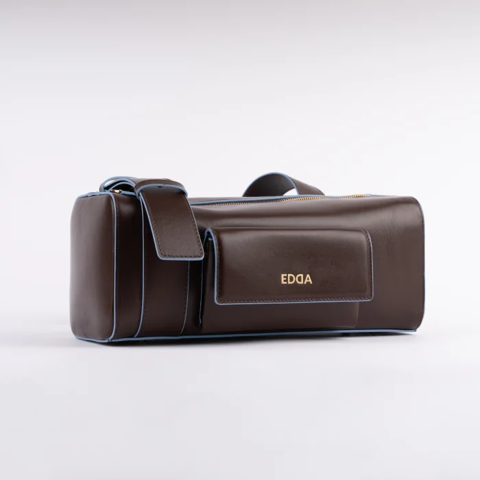 Square prism bag in dark brown calf leather with zipper closure, adjustable shoulder strap, one side pocket with magnetic closure, internal pocket with zip, blue stitching, and silver logo at the front. Complete with internal brown velvet lining.
