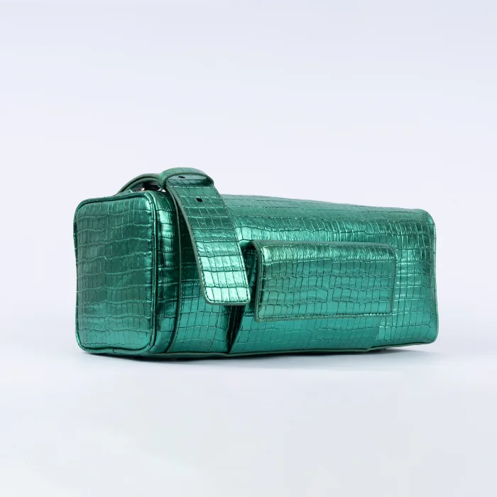 Square prism bag made of bright green crocodile patterned leather with zippers and adjustable shoulder straps. It has a front pocket with magnetic closure and a zippered inner pocket. The edges are painted green and there is a silver logo on the front. The inside is green-slipped.