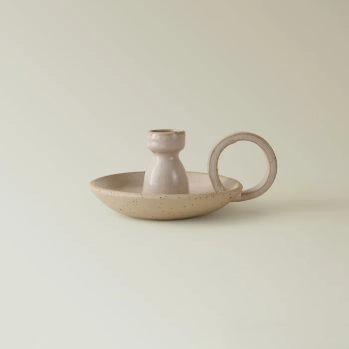 Product: Cream Stoneware Candle Holder With Handle