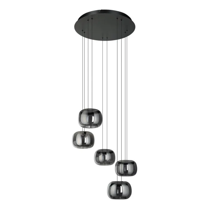 Bulb holder type: LED Maximum wattage: 5X5.8W The bulb is included in the product. Product Height: 150 cm Product Diameter: 50 cm Net Weight: 4.47 Kg Main Material: Steel Main Color: Black Glass/Hat Material: Vaporized Glass Glass/Hat Color: Black-Transparent Kelvin: 3000K IP Status: IP20 Switch Type: Wall Switch Product Voltage: 220-240V,50/60Hz