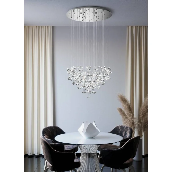 Bulb holder type: LED Maximum wattage: 43X2.5W The bulb is included in the product. Product Height: 110 cm Product Diameter: 78 cm Net Weight: 20.68 Kg Main Material: Stainless Steel Main Color: Chrome Glass/Hat Material: Polished Glass Glass/Hat Color: Transparent Kelvin: 3000K Lumens: 11610 IP Status: IP20 Switch Type: Wall Switch Product Voltage: 220-240V,50/60Hz