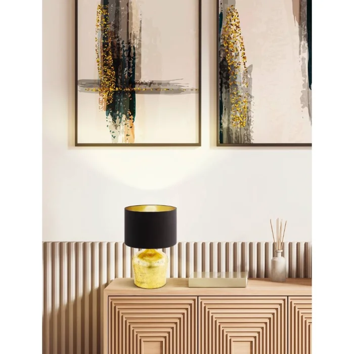 Bulb Holder Type: E27 Maximum Wattage: 1X60W Product Height: 38 cm Product Diameter: 25 cm Net Weight: 1.31 Kg Main Material: Steel Main Color: Gold Glass/Hat Material: Textile Fabric Glass/Hat Color: Black, Gold IP Status: IP20 Switch Type: Cable Switched Product Voltage: 220-240V,50/60Hz