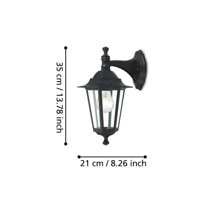 Bulb Holder Type:E27 Maximum Wattage: 1X60W Product Height: 35 cm Product Length: 16.5 cm Provision Protrusion: 21 cm Net Weight: 0.95 Kg Main Material: Aluminum Die Casting Main Color: Black Glass/Hat Material: Glass Glass/Hat Color: Transparent IP Status: IP44 Functions: Corner Connection Switch Type: Wall Switch Product Voltage: 220-240V,50/60Hz