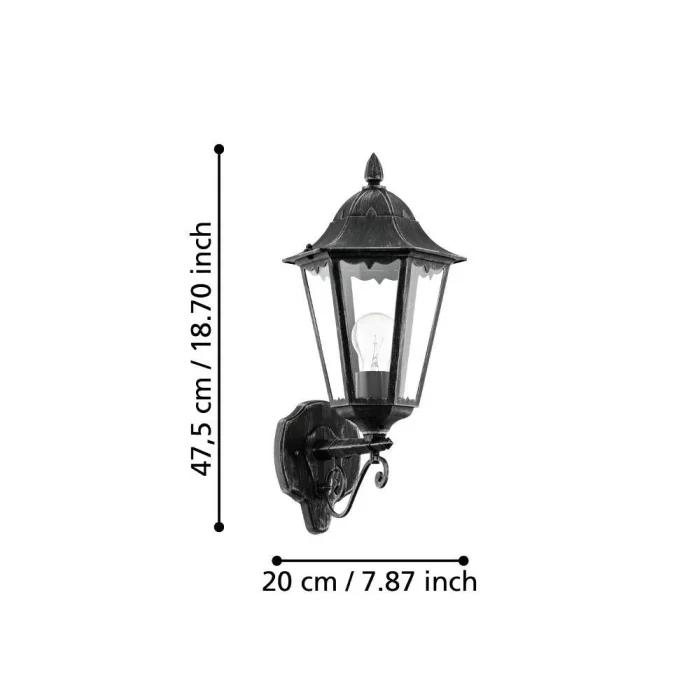 Bulb Holder Type:E27 Maximum Wattage: 1X60W Product Height: 47.5 cm Product Length: 20 cm Provision Protrusion: 28.5 cm Net Weight: 1.74 Kg Main Material: Aluminum Casting Main Color: Black, Silver-Patinated Glass/Hat Material: Glass Glass/Hat Color: Transparent IP Status: IP44 Functions: Corner Connection Switch Type: Wall Switch Product Voltage: 220-240V,50/60Hz