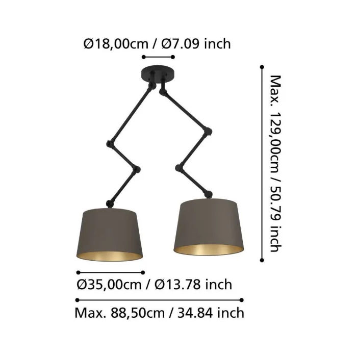 Bulb Holder Type: E27 Maximum Wattage: 2X40W Product Height: 129 cm Net Weight: 5.47 Kg Main Material: Steel Main Color: Black Glass/Hat Material: Textile Fabric Glass/Hat Color: Cappuccino, Brass IP Status: IP20 Switch Type: Wall Switch Product Voltage: 220-240V,50/60Hz