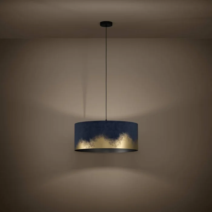 Bulb Holder Type: E27 Maximum Wattage: 1X40W Product Height: 150 cm Product Diameter: 53 cm Net Weight: 2.25 Kg Main Material: Steel Main Color: Black Glass/Hat Material: Textile Fabric Glass/Hat Color: Blue, Gold IP Status: IP20 Switch Type: Wall Switch Product Voltage: 220-240V,50/60Hz