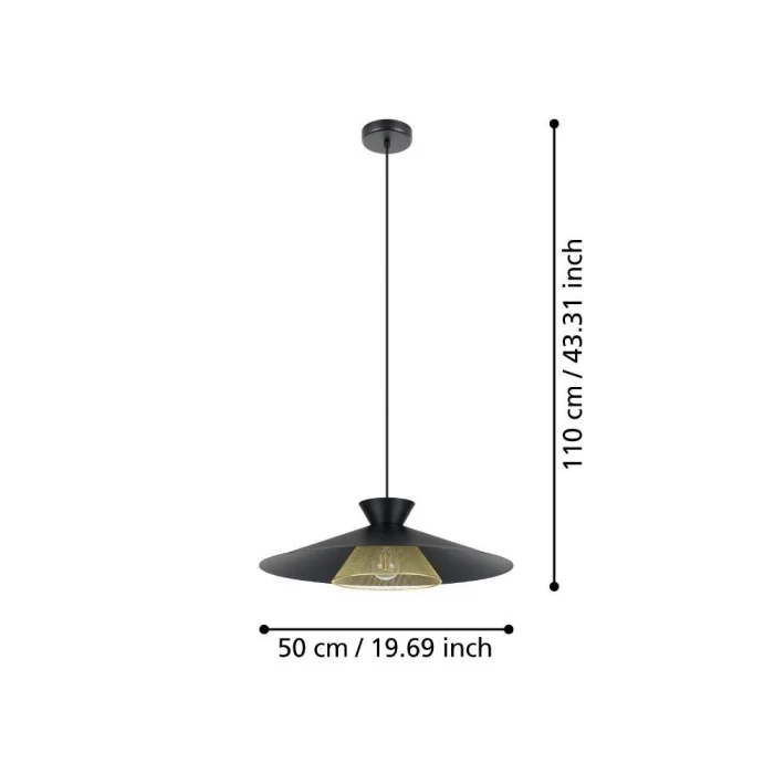 Bulb Holder Type: E27 Maximum Wattage: 1X40W Product Height: 110 cm Product Diameter: 50 cm Net Weight: 2.94 Kg Main Material: Steel Main Color: Black, Brass IP Status: IP20 Switch Type: Wall Switch Product Voltage: 220-240V,50/60Hz