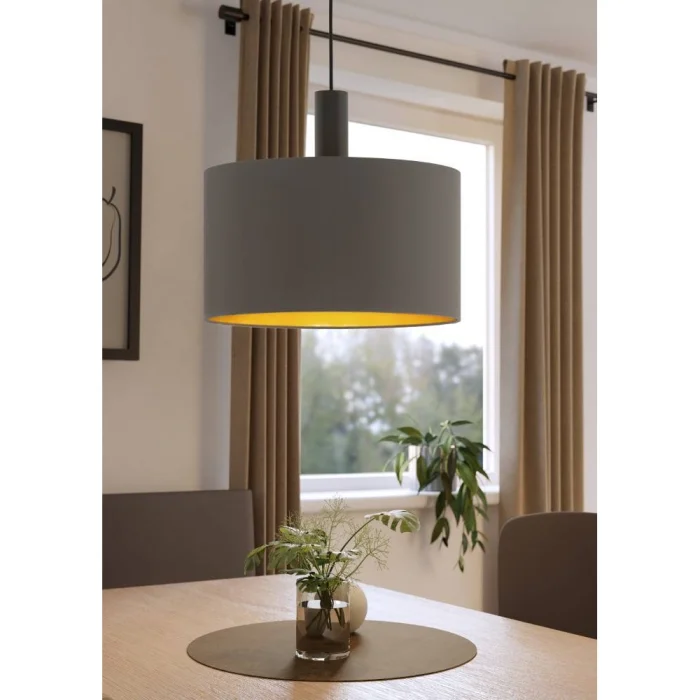 Bulb Holder Type: E27 Maximum Wattage: 1X60W Product Height: 150 cm Product Diameter: 38 cm Net Weight: 1.53 Kg Main Material: Steel Main Color: Dark Brown Glass/Hat Material: Textile Fabric Glass/Hat Color: Cappuccino, Gold IP Condition: IP20 Switch Type: Wall Switch Product Voltage: 220-240V,50/60Hz