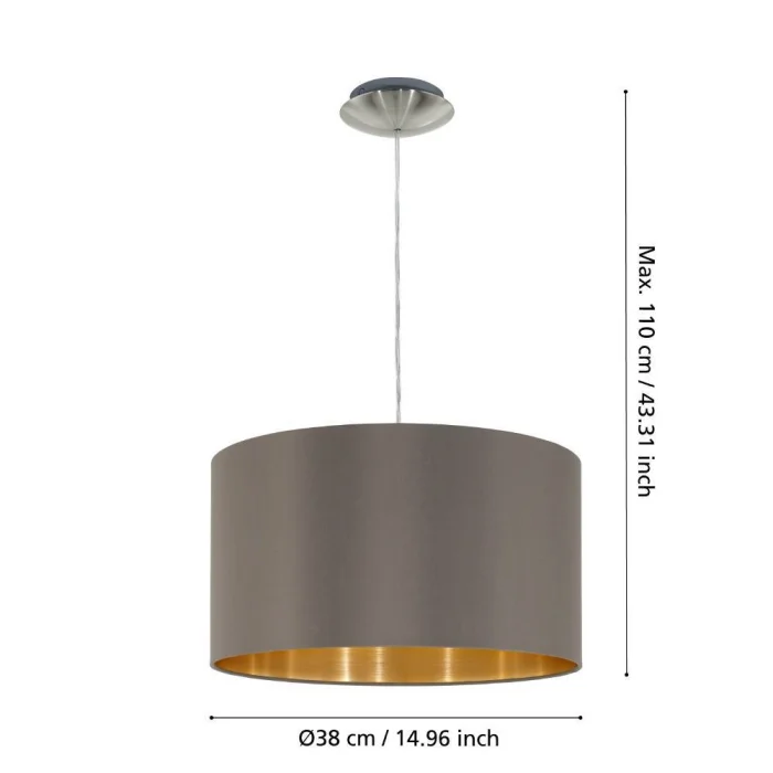 Bulb Holder Type: E27 Maximum Wattage: 1X60W Product Height: 110 cm Product Diameter: 38 cm Net Weight: 1.23 Kg Main Material: Steel Main Color: Nickel Matte Glass/Hat Material: Textile Fabric Glass/Hat Color: Cappuccino, Gold IP Status: IP20 Switch Type: Wall Switch Product Voltage: 220-240V,50/60Hz