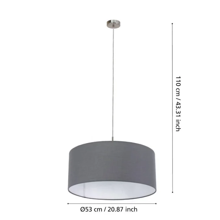 Bulb Holder Type: E27 Maximum Wattage: 1X60W Product Height: 110 cm Product Diameter: 53 cm Net Weight: 1.96 Kg Main Material: Steel Main Color: Nickel Matte Glass/Hat Material: Textile Fabric Glass/Hat Color: Grey IP Status: IP20 Switch Type: Wall Switch Product Voltage: 220-240V,50/60Hz