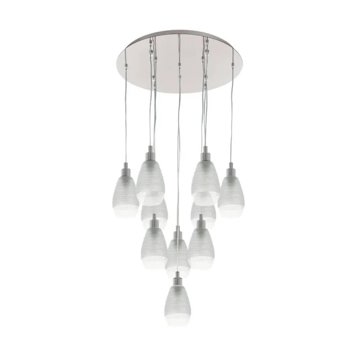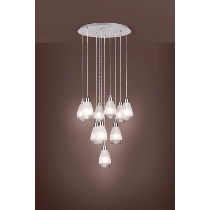 Bulb Holder Type: E27 Maximum Wattage: 10X60W Product Height: 150 cm Product Diameter: 61.5 cm Net Weight: 11.28 Kg Main Material: Steel Main Color: Nickel Matte Glass/Hat Material: Frosted Glass Glass/Hat Color: White, Transparent IP Status: IP20 Switch Type: Wall Switch Product Voltage: 220-240V,50/60Hz