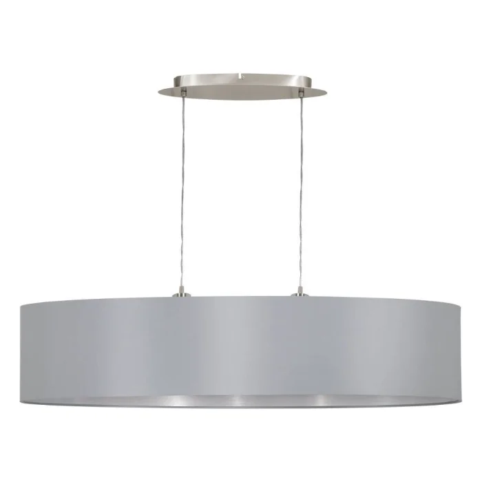 Bulb Holder Type: E27 Maximum Wattage: 2X60W Product Height: 110 cm Product Length: 100 cm Product Width 25 cm Net Weight: 2.72 Kg Main Material: Steel Main Color: Nickel Matte Glass/Hat Material: Textile Fabric Glass/Hat Color: Grey, Silver IP Status: IP20 Switch Type: Wall Switch Product Voltage: 220-240V,50/60Hz