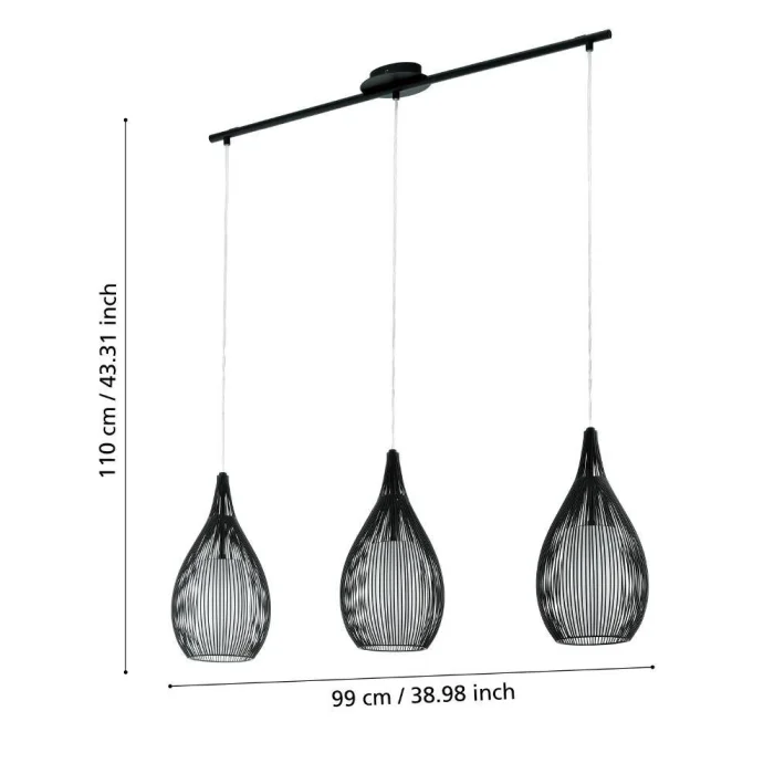 Bulb Holder Type: E27 Maximum Wattage: 3X60W Product Height: 110 cm Product Length: 99 cm Product Width 19 cm Net Weight: 5.85 Kg Main Material: Steel Main Color: Black Glass/Hat Material: Frosted Glass, Steel Glass/Hat Color: Black, White IP Status: IP20 Switch Type: Wall Switch Product Voltage: 220-240V,50/60Hz
