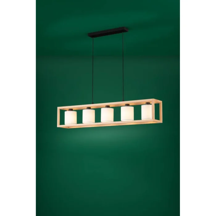 Bulb Holder Type: E27 Maximum Wattage: 5X25W Product Height: 150 cm Product Length: 100 cm Product Width 20 cm Net Weight: 5.31 Kg Main Material: Steel, Wood Main Color: Black, Brown Glass/Hat Material: Textile Fabric Glass/Hat Color: White IP Status: IP20 Switch Type: Wall Switch Product Voltage: 220-240V,50/60Hz