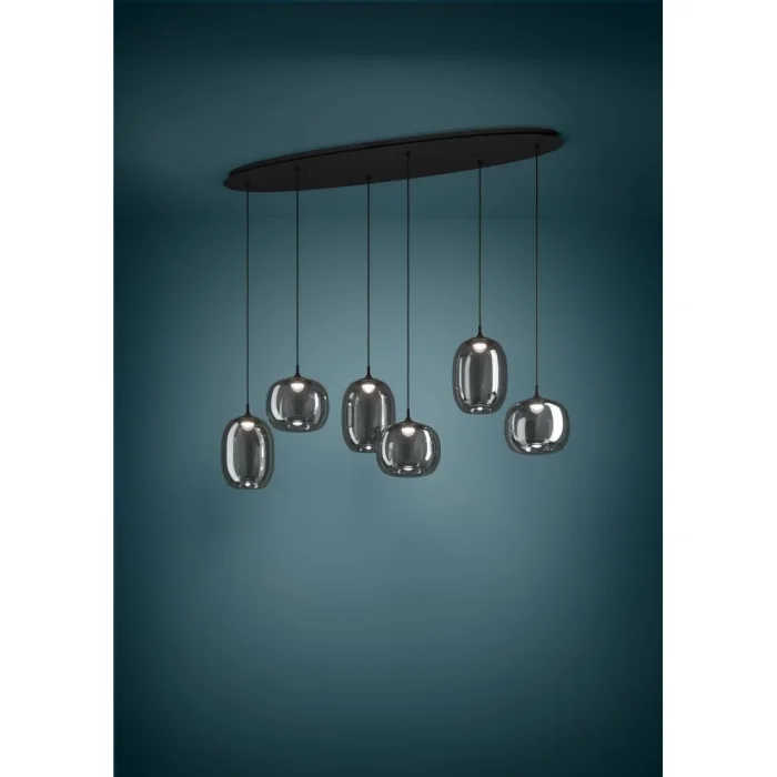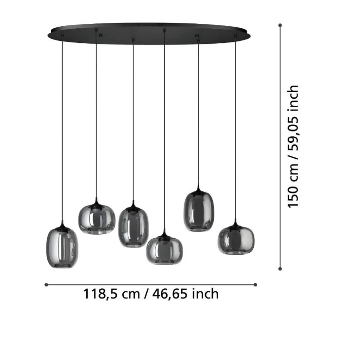 Bulb Holder Type: LED Maximum Wattage: 6X3.7W bulb included. Product Height: 150 cm Product Length: 118.5 cm Product Width 33 cm Net Weight: 5.74 Kg Main Material: Steel Main Color: Black Glass/Hat Material: Frosted Glass Glass/Hat Color: Black-Transparent Kelvin: 2700-6500K Lumens: 3060 IP Status: IP20 Functions: Cct, Control by Remote Control, Remote Control Included Switch Type: Wall Switch Product Voltage: 220-240V,50/60Hz