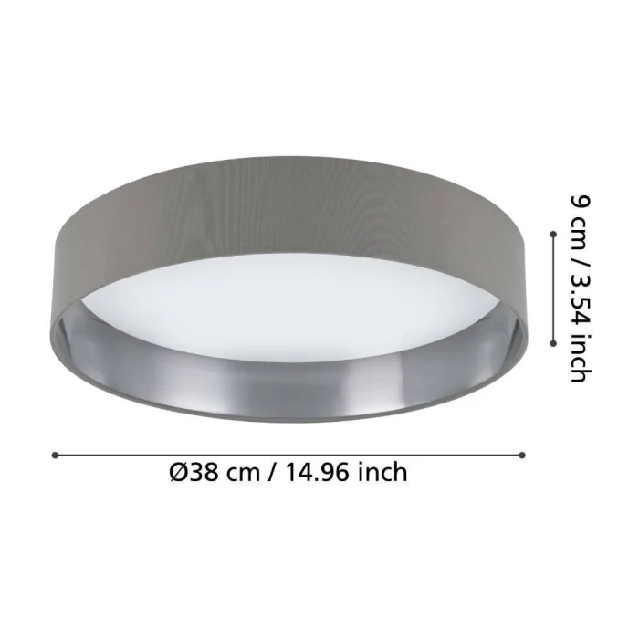 Bulb Holder Type: LED Maximum Wattage: 20W Bulb Included. Product Height: 9 cm Product Diameter: 38 cm Net Weight: 1.21 Kg Main Material: Plastic, Steel Main Color: White Glass/Hat Material: Textile Fabric Glass/Hat Color: Grey, Silver Kelvin: 3000K Lumens: 2400 IP Status: IP20 Switch Type: Wall Switch Product Voltage: 220-240V,50/60Hz