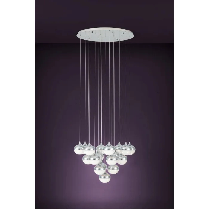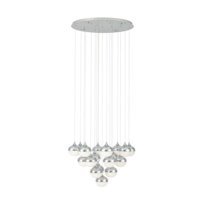 Bulb Holder Type: LED Maximum Wattage: 18X3.15W bulb included. Product Height: 200 cm Product Diameter: 81 cm Net Weight: 18.41 Kg Main Material: Steel Main Color: Chrome Glass/Hat Material: Plastic Glass/Hat Color: Granular White, Transparent Kelvin: 3000K Lumens: 8280 IP Status: IP20 Switch Type: Wall Switch Product Voltage: 220-240V,50/60Hz