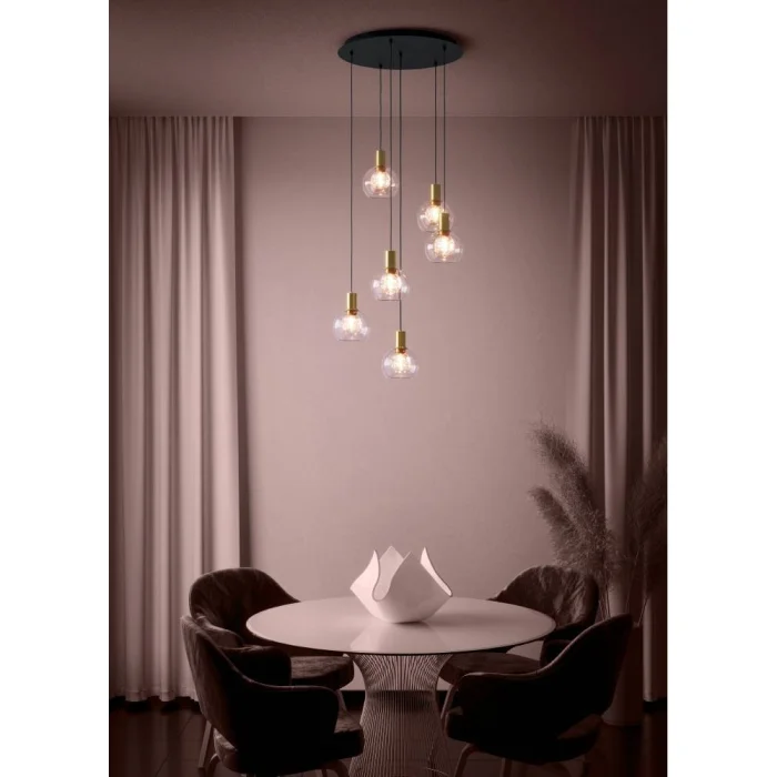 Bulb Holder Type: LED Maximum Wattage: 6X5.4W bulb included. Product Height: 150 cm Product Diameter: 54 cm Net Weight: 7.8 Kg Main Material: Steel Main Color: Black, Brushed Brass Glass/Hat Material: Glass Glass/Hat Color: Transparent Kelvin: 3000K Lumens: 3060 IP Status: IP20 Switch Type: Wall Switch Product Voltage: 220-240V,50/60Hz
