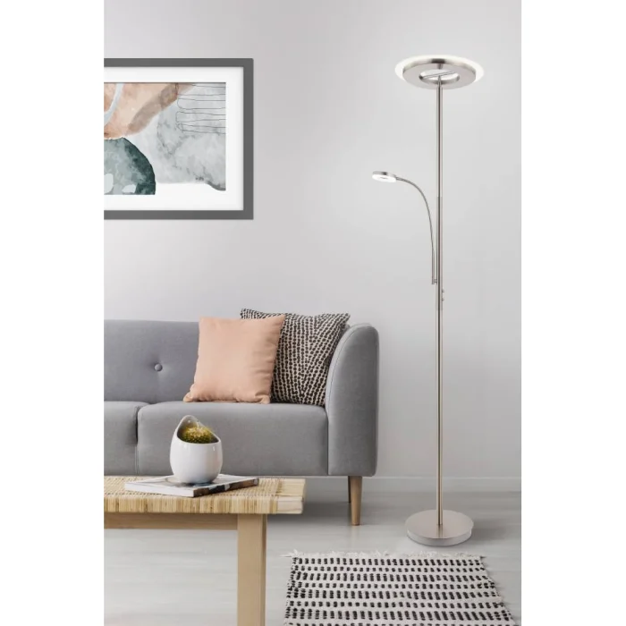 Bulb holder type: LED/LED Maximum wattage: 1X30W/1X4W bulb included. Product Height: 180 cm Product Diameter: 35 cm Net Weight: 6.19 Kg Main Material: Steel Main Color: Nickel Matte Glass/Hat Material: Frosted Glass Glass/Hat Color: White Kelvin: 2700K Lumens: 3500/450 IP Status: IP20 Switch Type: Touch Product Voltage: 220-240V,50/60Hz