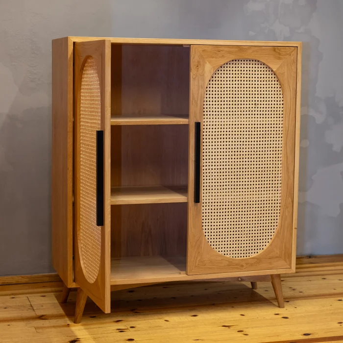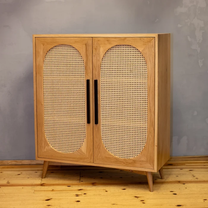 The natural rattan (hazeran) surfaces used on the doors allow the inside of the cabinet to breathe and add a natural touch.